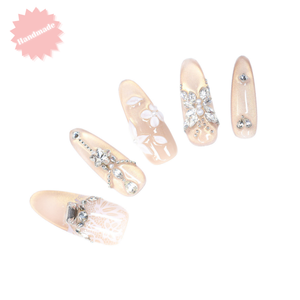 Butterfly Lace Champagne is a handmade long almond press on manicure in champagne nude shimmer with a glossy salon finish, crafted with premium acrylic and salon grade gel. Features a rhinestone butterfly statement nail, lace-painted thumb, and delicate crystal accents, perfect for weddings and engagement photos.