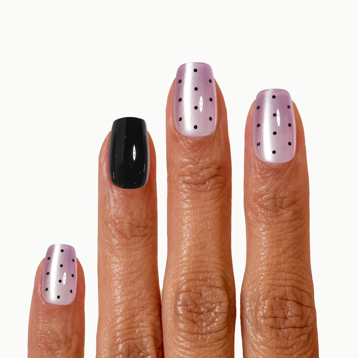 Dot Me Darling Press On Nails feature a short square shape with a soft lavender base and tiny black polka dots for a playful, graphic look that still feels clean and wearable. Made with high density PMMA acrylic and finished with a UV cured salon grade gel coating, they feel strong and non bendy with a smooth glossy surface that looks like a professional manicure. Glossy black accent nails add bold contrast, making the lavender pop while keeping the overall vibe sleek and modern. Each premium 30 piece full design set includes multiple sizes plus backup nails for a secure, reusable at home fit.