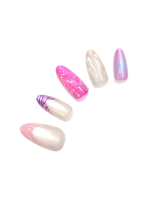 Island Bloom Mix is the “vacation nails” set that looks styled on purpose — not like ten matching nails. This design is mismatched left and right hand, so your manicure feels like a curated nail wardrobe: bright hibiscus moments, tropical leaf accents, shell-inspired details, and soft pearly fades that keep everything wearable.