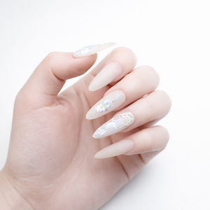From a distance, the look is minimal and neutral. Up close, the lace florals and bouquet details reveal themselves, creating depth that feels couture rather than busy. This makes Ivory Lace Bouquet especially flattering for bridal looks, engagement photos, formal events, or any moment when you want your nails to look elevated but never loud.