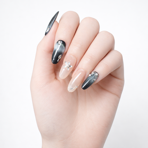 Each nail is individually handcrafted using a premium PMMA acrylic nail base and layered with UV-cured salon gel, resulting in a smooth, glass-like finish and a noticeably sturdier feel than mass-produced press-ons. The oval shape softly elongates the fingers, while nude blush tones fade into icy silver chrome gradients for a refined, modern look.