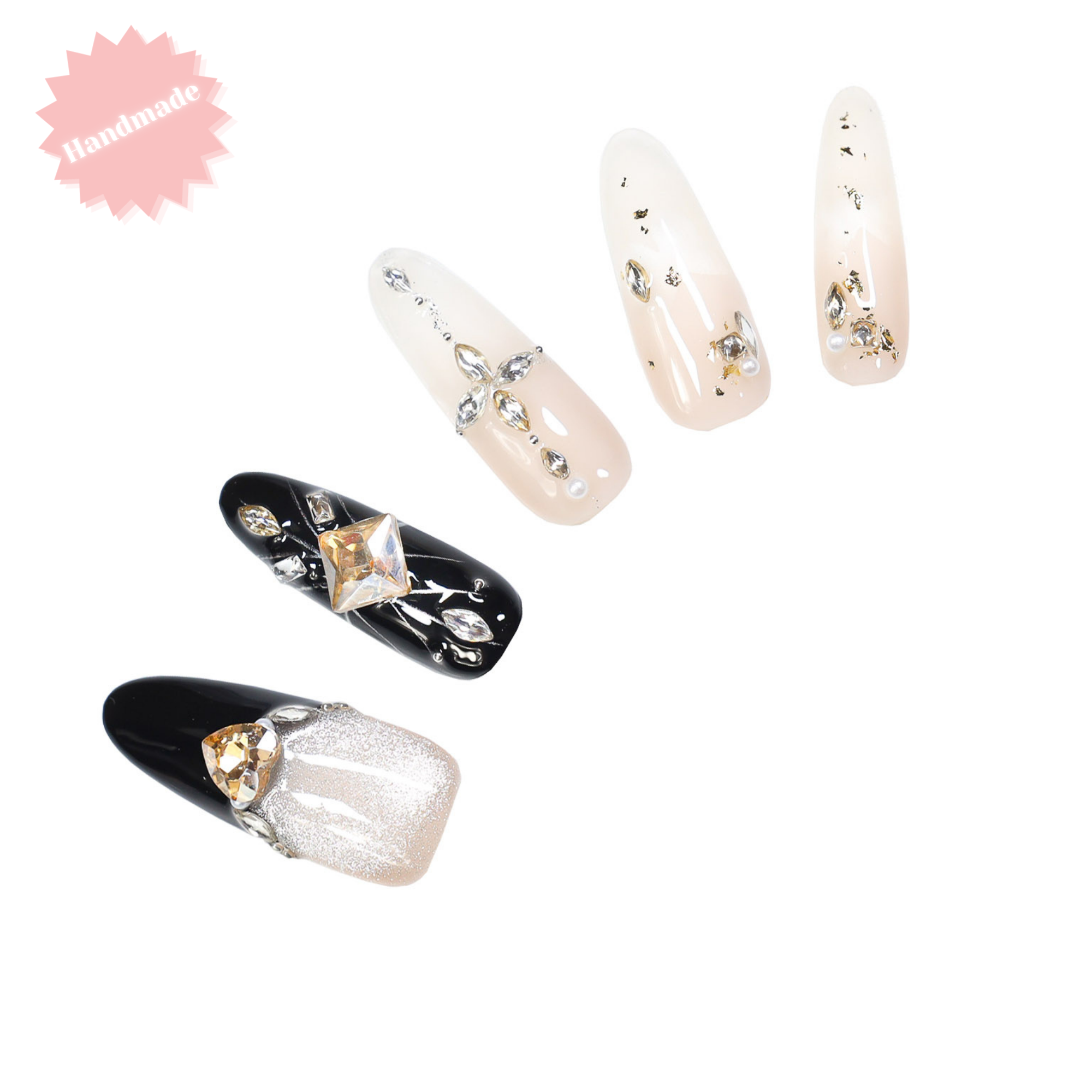 Gilded Noir is a handmade long almond press on manicure featuring a nude to milky ombré base with black statement nails and silver shimmer accents, crafted with premium acrylic and salon grade gel for a chip resistant, high gloss finish. Gold foil flakes, pearls, and rhinestone look perfect for parties, formal events, and nights that call for luxe glam.